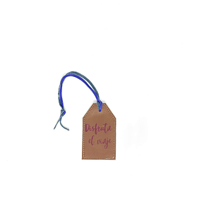 tag de equipaje "mas viajes por favor" cuero naranjo - Travel Deco Store